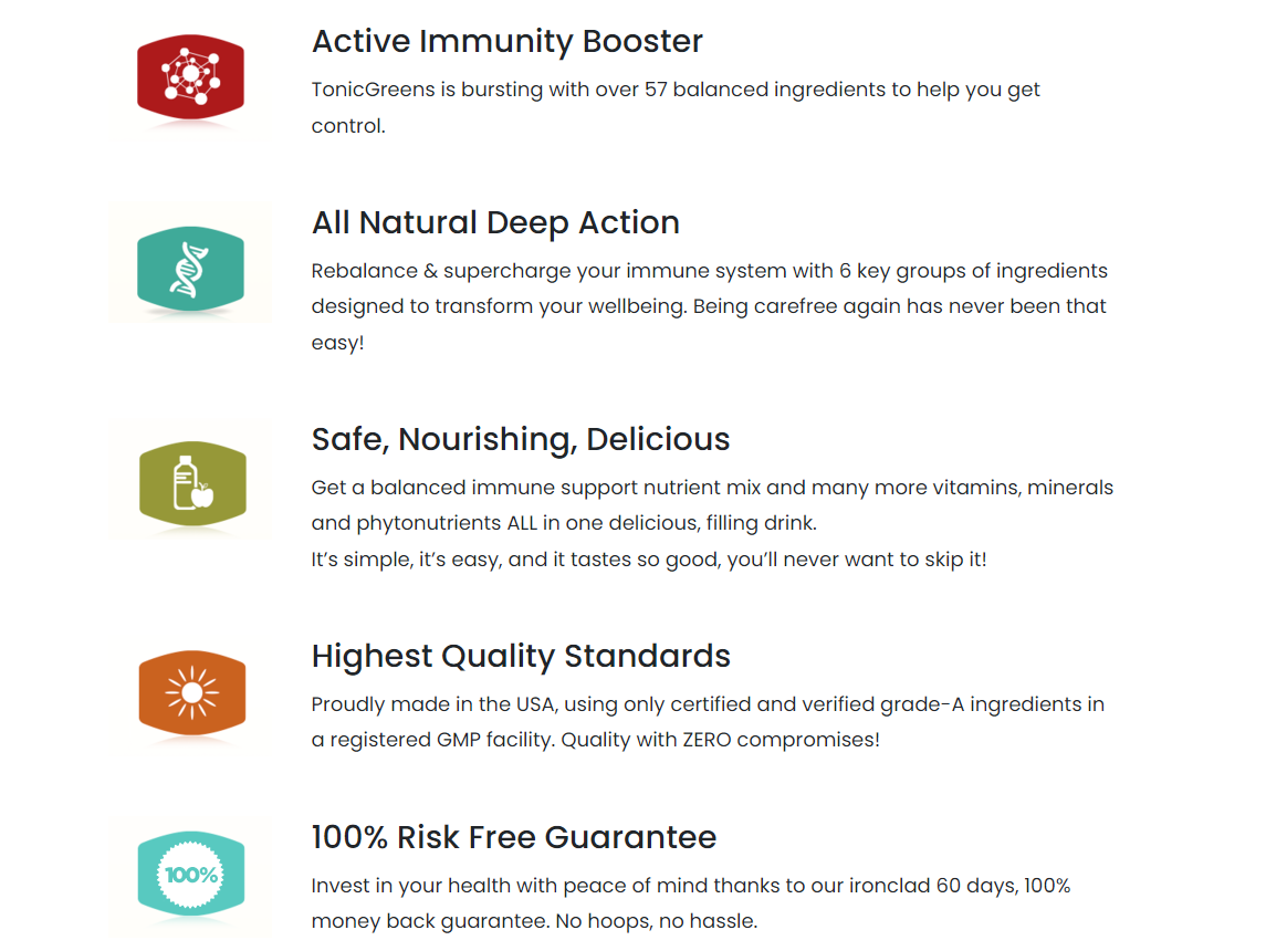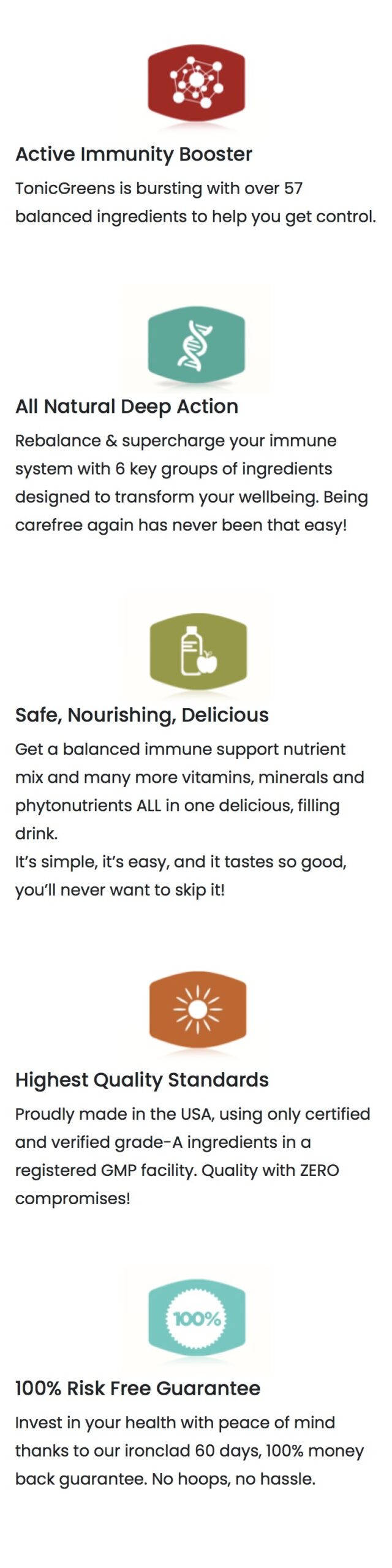 TonicGreens is conveniently packed with over 57 cleansing herbs, specific vitamins, prebiotics, probiotics and grade A nutrients to support the immune system & overall wellness in as little time as possible!